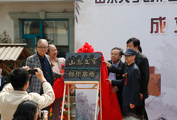 原青島市文學(xué)藝術(shù)界聯(lián)合會主席青島書畫美術(shù)創(chuàng)作院院長李愷心;山東省書協(xié)副主席、青島市書協(xié)副主席張偉;青島中山書畫院院長劉世俊等領(lǐng)導(dǎo)為山東文學(xué)創(chuàng)作基地揭牌