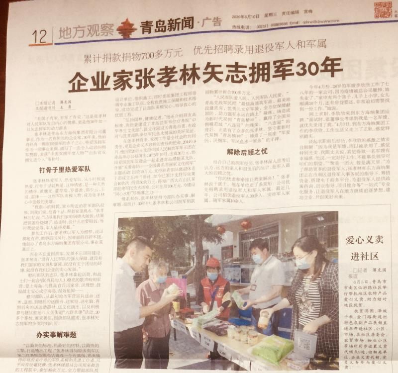 2020年6月10日,青島東方海納集團董事長張孝林擁軍事跡被《大眾日報》刊發(fā)(查看文章鏈接請點擊文字)。